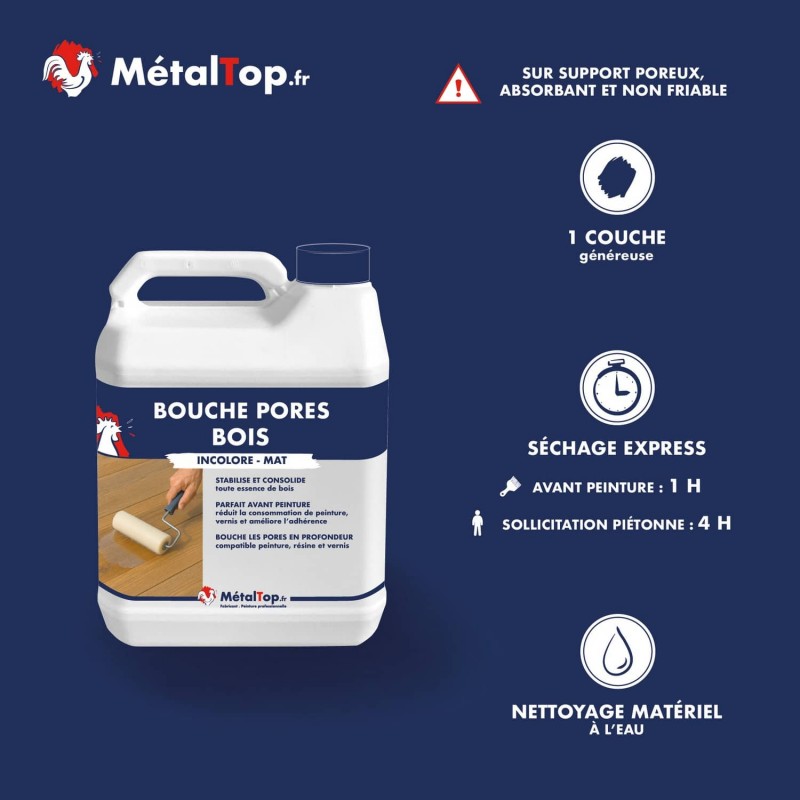 Un bouche-pores est un produit liquide ou pâteux qui pénètre dans les pores du bois pour les saturer partiellement. Il prépare le support avant l’application d’une finition comme un vernis ou une peinture. Service technique Métaltop