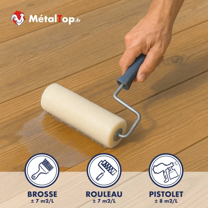 - Facile à appliquer : Application directe au rouleau, pinceau ou chiffon sur bois brut ou poncé.